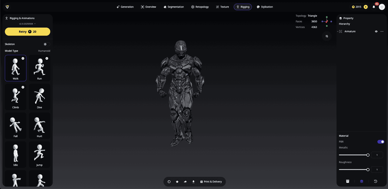 Rigging is traditionally one of the most technical and time-consuming stages in 3D production. Tripo simplifies this entire process with one-click AI auto-rigging, instantly turning static meshes into animation-ready characters. Powered by semantic analysis, the system recognizes the structure of any model—whether humanoid, quadruped, creature, or mechanical—and automatically builds the correct skeletal hierarchy. Joints are placed in anatomically or functionally appropriate positions, and precise skin weights ensure smooth deformation during animation.