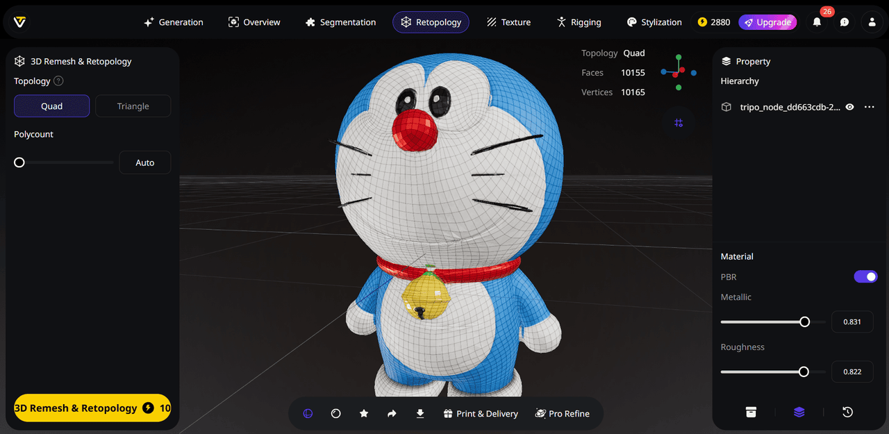 Retopology is traditionally one of the most time-consuming stages in 3D production, requiring artists to manually rebuild dense, irregular meshes into clean and efficient geometry. Tripo Studio automates this process, generating clean quad or triangle meshes with optimized topology.