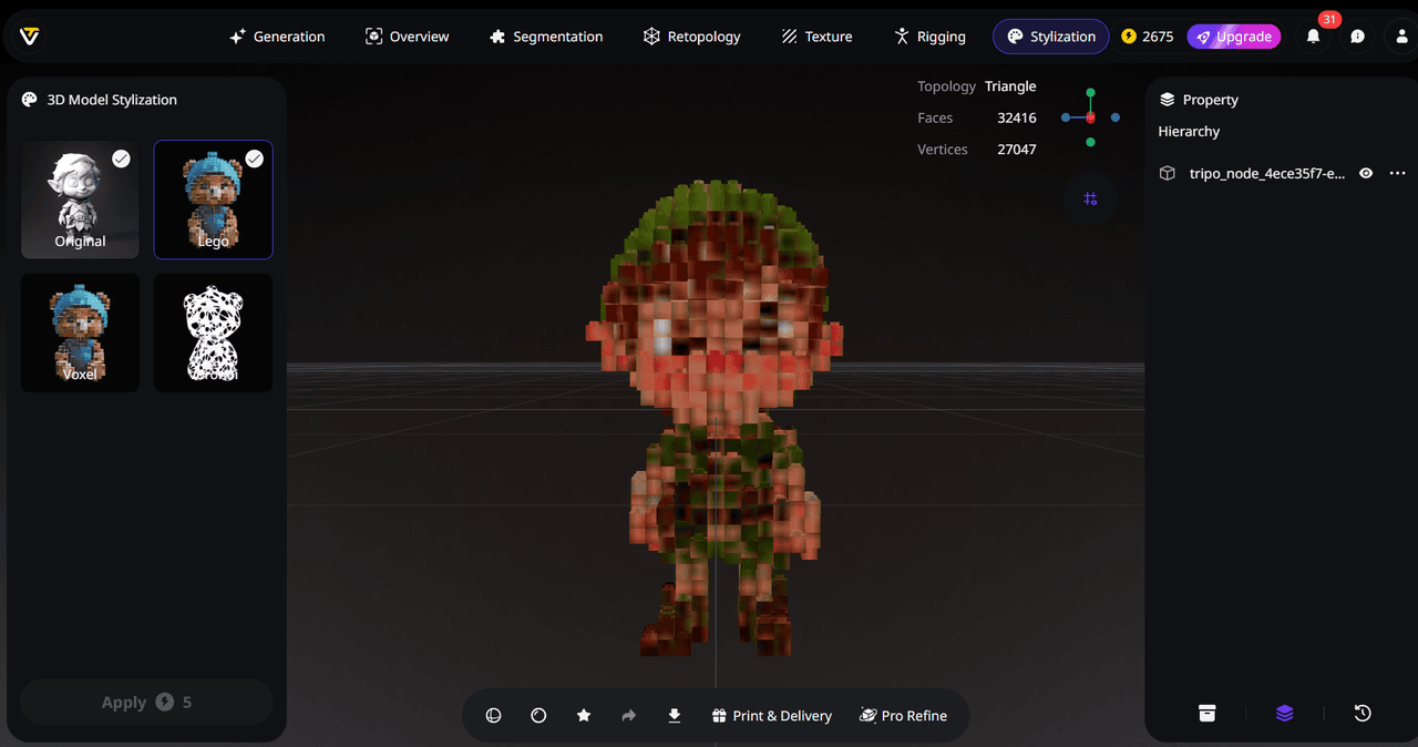 The AI Model Stylization feature lets creators instantly transform any 3D asset into a fresh artistic style with a single click. Whether you want Lego or voxel, the system applies stylistic changes without requiring manual remodeling or shader adjustments.