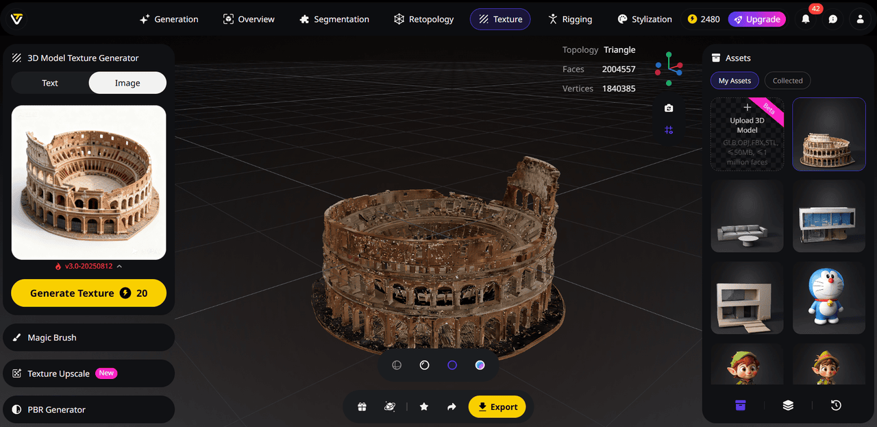 Tripo's latest Ultra HD Texture engine delivers sharper detail, cleaner edges, and distortion-free results across all materials. Paired with the Ultra Mesh setting, it ensures excellent consistency and clarity. The new Texture Upscale feature pushes quality even further by intelligently boosting resolution while preserving the original artistic intent.